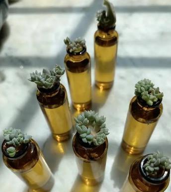 口服液瓶子的大小和形狀,將掉落的葉片放在瓶底的土壤上,很快就會長出小芽和根系。簡直就是為多肉植物量身定做的迷你花房。